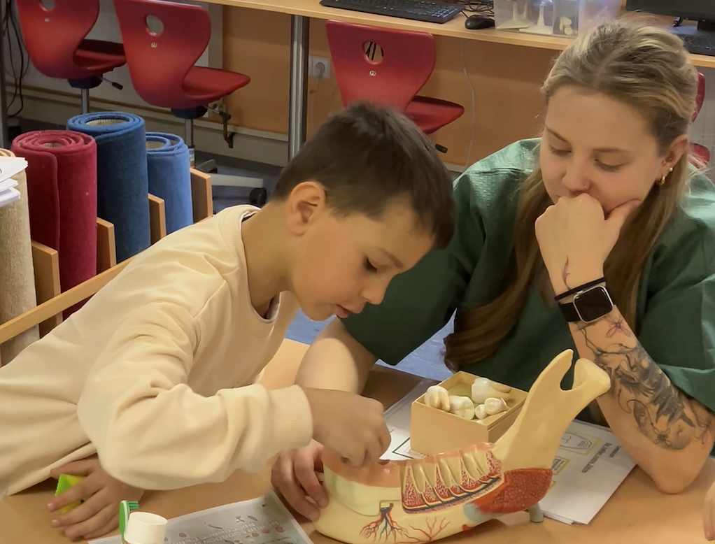 Es wurde geknetet, gebastelt, geforscht und ausprobiert. Die Kinder formten eigene Gebisse, gestalteten informative Plakate und entdeckten Zahnbakterien mit der Lupe. Besonders spannend war das Anfärben der Zähne. Dabei konnten die Grundschülerinnen und Grundschüler selbst sehen, wo noch Beläge vorhanden waren – und im Anschluss direkt noch einmal die richtige Putztechnik üben.