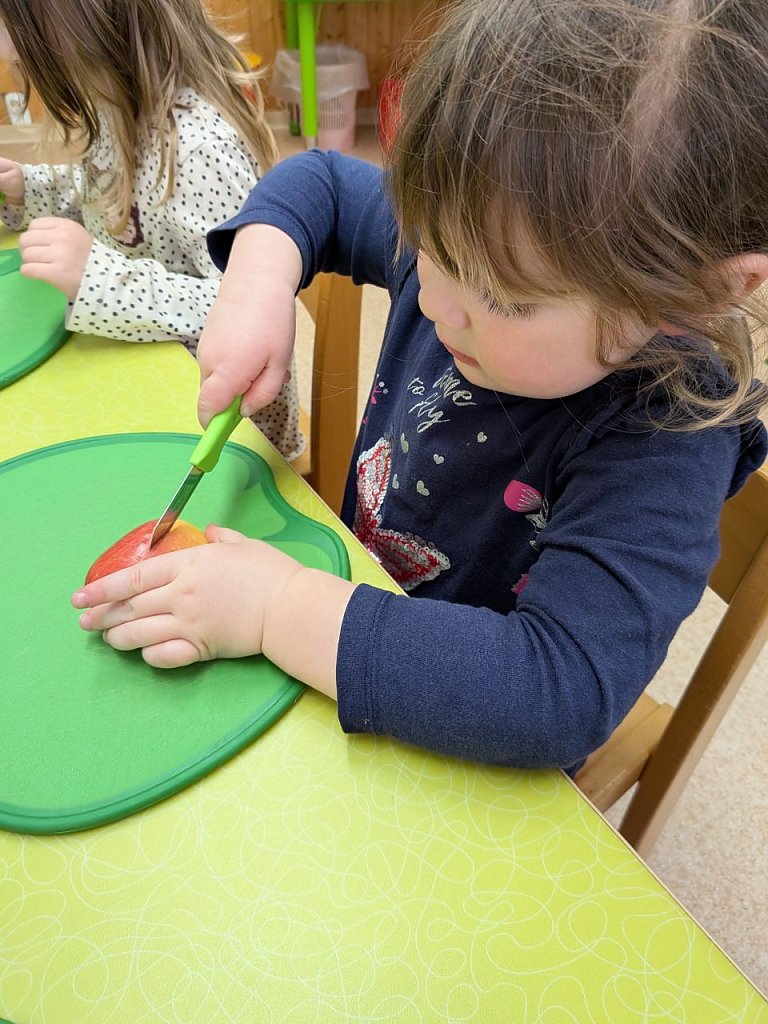 Mit großer Begeisterung schnitten die Kinder frisches Obst und Gemüse klein und gestalteten bunte Obstspieße sowie knackige Gemüsesticks. Besonders spannend war es, eigene Dips herzustellen und neue Geschmacksrichtungen auszuprobieren. So konnten die kleinen Köchinnen und Köche spielerisch erfahren, wie gut gesunde Snacks schmecken können.