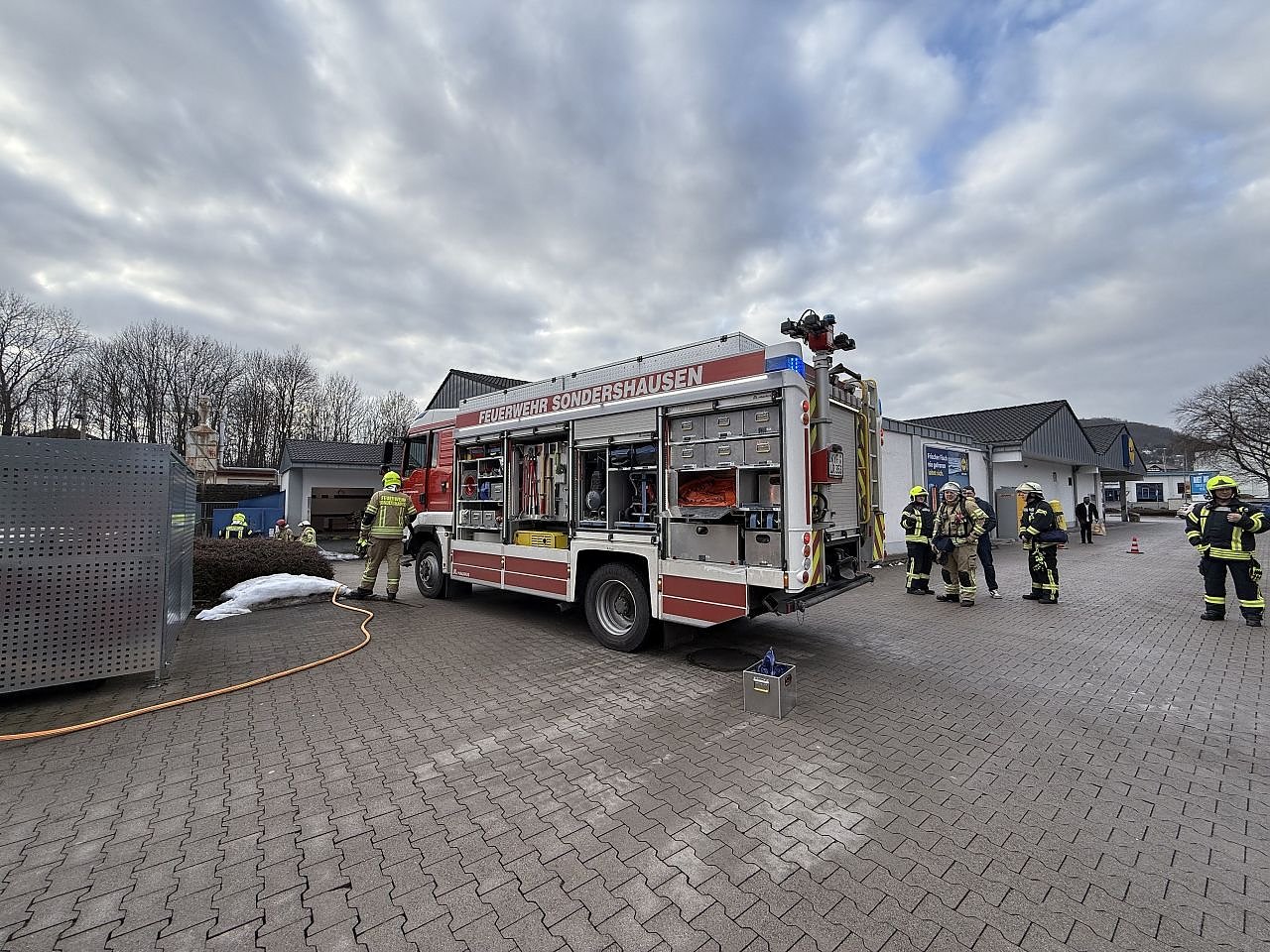 Durch den Pressvorgang wurde das Gerät zerstört. Es gab einen Kurzschluss, welcher Pappe und Papier in der näheren Umgebung des Gerätes in Brand setzte. Durch das schnelle Eingreifen der Feuerwehr konnte ein größerer Schaden verhindert werden. Die Sondershäuser Feuerwehr war mit 20 Einsatzkräften vor Ort. Nach 45 Minuten konnte der Einsatz beendet werden.