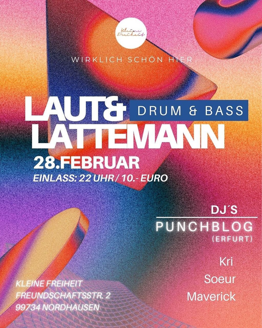 Die Kleine Freiheit lädt am Samstag zur nächsten Ausgabe ihres elektronischen Musikformats Laut & Lattemann in die Freundschaftsstraße 2 ein. Dieses Mal steht Drum & Bass im Mittelpunkt – komplexe Breakbeats gemischt mit tiefen, wuchtigen Basslines...Als musikalische Gäste stehen die drei DJs von Punchblog aus Erfurt auf dem Line-up: Soeur, Maverick und Krl bringen treibende Beats und dunkle Basslines mit, die den Dancefloor in Bewegung setzen.