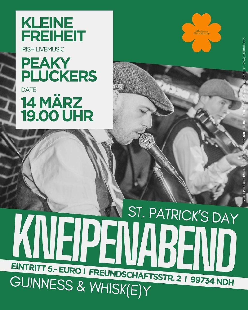 Am kommenden Samstag wird es in der Kleinen Freiheit in der Freundschaftsstraße 2 wieder grün: Anlässlich des St. Patrick’s Day lädt der Verein zum bereits wohlbeliebten Kneipenabend mit stimmungsvoller Irish Folk Music, Guinness vom Fass sowie einer Auswahl guter Whisk(e)ys...Für die passende musikalische Atmosphäre sorgt die Band The Peaky Pluckers aus Hamburg, die mit traditionellen irischen Songs, Folk-Klassikern und authentischem Auftreten echtes Pub-Feeling auf die Bühne bringt. Die Gäste können sich auf einen geselligen Abend mit handgemachter Musik, guter Stimmung und typisch irischem Flair freuen.