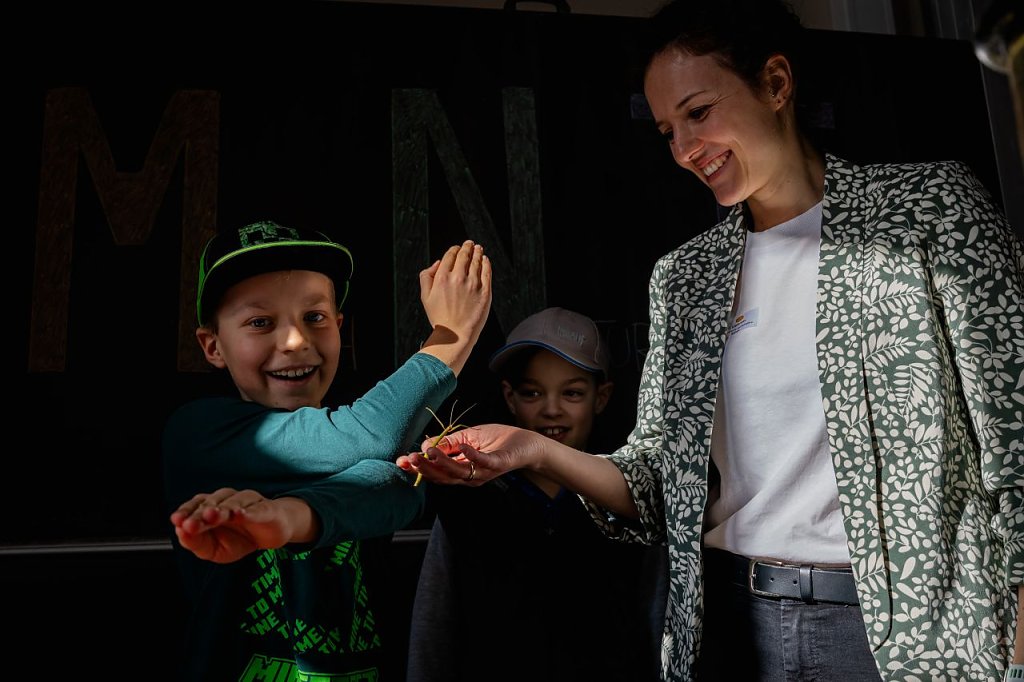 Im Anschluss konnten die Besucherinnen und Besucher verschiedene Fachräume erkunden und dabei Einblicke in den Unterricht gewinnen. In der Biologie wurden die Kinder selbst aktiv und pflanzten Sonnenblumensamen ein. Außerdem konnten sie lebende Tiere aus nächster Nähe beobachten – darunter Axolotl und Stabheuschrecken, die bei vielen Gästen für große Begeisterung sorgten. In den Chemieräumen beeindruckten farbenfrohe Experimente die jungen Besucherinnen und Besucher.