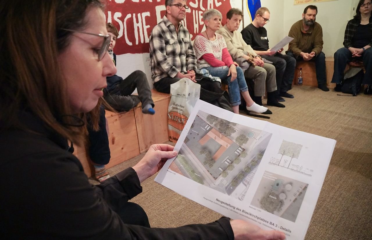 Viele Kinder würden den Baum zum Klettern nutzen, zudem müsse ein gesunder Baum erhalten bleiben, so Tuschy. Pascal Leibbrandt, Fraktionsvorsitzender der Grünen im Stadtrat, war gekommen, um den Entscheidungsprozess im Stadtrat noch einmal zu erläutern. Eine Änderung der Pläne, etwa eine Integration des alten Baumes in das neue Platzkonzept, sei zum gegenwärtigen Zeitpunkt kaum mehr möglich, da die Bauarbeiten längst laufen. Die Stadtratsbeschlüsse seien bereits gefasst, und die Verwaltung setze diese nun um. Zudem sei die aktuelle Planung an Fördermittel gebunden.