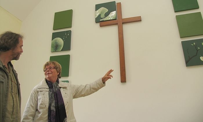 Ortsbürgermeisterin Jutta Busch und Jürgen Rennebach von der Jugendkunstschule in der neuen Trauerhalle