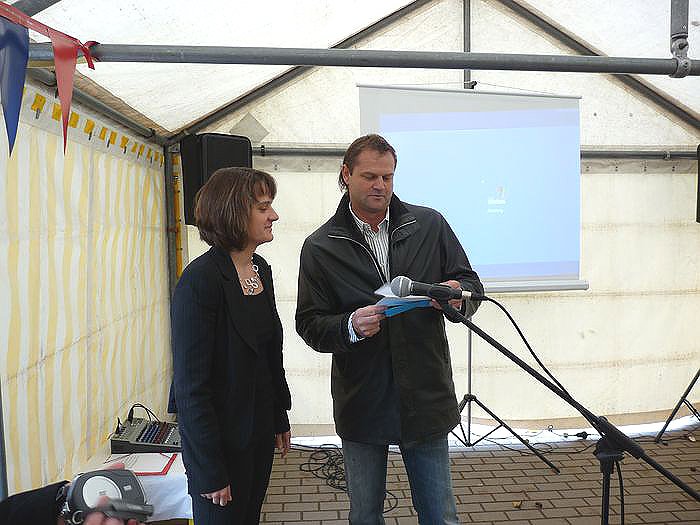 Viele Gäste konnte die Leiterin der Einrichtung, Andrea Hotze (Bild unten), heute in Hachelbich begrüßen. Ein Zelt musste extra aufgebaut werden, weil in der Einrichtung selbst nicht so ein Raum ist, der genutzt werden könnte, ohne die Kinder ausquartieren zu müssen. Natürlich waren der Vorsitzende des Trägervereins der Einrichtung (Starthilfe e.V.) Georg Schäfer und der Geschäftsführer Jürgen Rauschenbach mit dabei. Schäfer gleich in Doppelfunktion, denn er vertrat den Landrat, der heute nicht teilnehmen konnte.