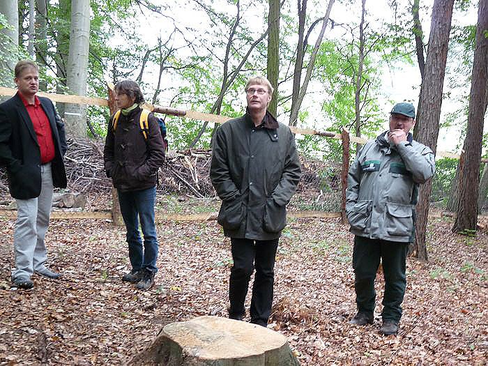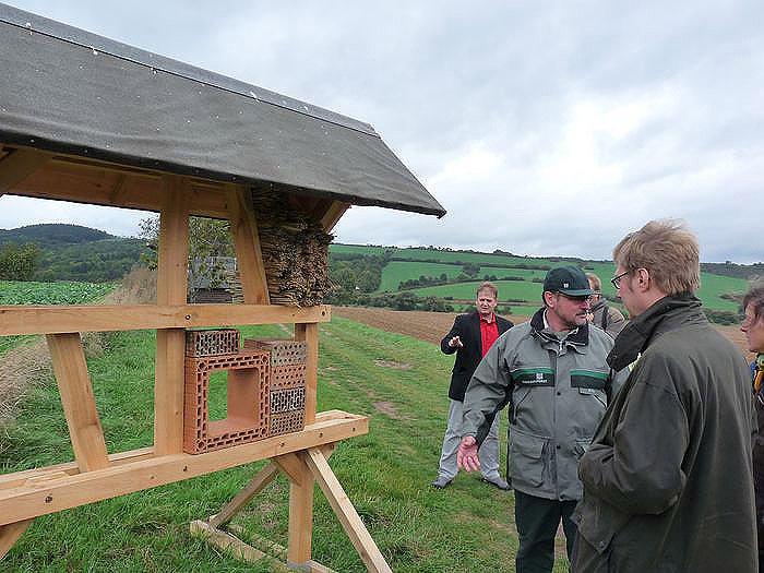 Nach der Theorie kam die Praxis. Mit einem Gang zu dem Waldgrundstück wurde schon mal sehr viel besichtigt. Unterwegs erläuterte Revierförster Birger Fix (Bild oben mit Dirk Adams) wie an einem Schauobjekt der Bau von Wildbienenwohnungen und anderen nützlichen Insekten unterstützt werden kann, und gleichzeitig die Kinder etwas lernen können. Dirk Adam von den Grünen zeigte sich begeistert. Später sollen auch andere Kindereinrichtungen und Schulen (die Östertalschule unterstützt das Projekt bereits) den Waldgarten nutzen können. Eine Webseite für die Informationen gibt es schon, www.abenteuerland-hachelbich.de