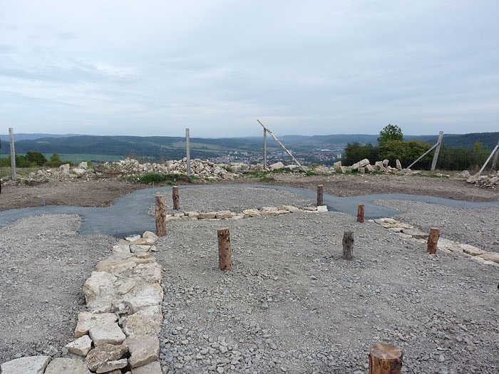 Auf die Fundamentumrisse werden dann noch sogenannte Gabionen aufgesetzt (ca. 50 cm hoch). Gabionen sind solche Drahtkäfige, in den Steine drin sind. Solche Konstruktionen sieht man häufig zur Sicherung von Wänden und Hängen gegenüber Wegen. Voraussichtlich werden die Gabionen noch dieses Jahr aufgesetzt. Dann wird auch der Wall mit dem bisherigen Drahtzaun verschwinden.
