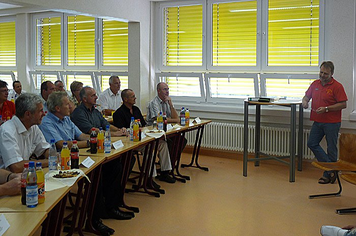 Thomas Schermer (re) bei der Präsentation Sportaktiv 2009. Fleißige Zuhörer waren im August u.a. Thüringens jetziger Ex-Minister für Bau, Landesentwicklung und Medien Gerold Wucherpfennig(CDU) und Brandenburgs Ministers für Bildung, Jugend und Sport, Holger Rupprecht (SPD).