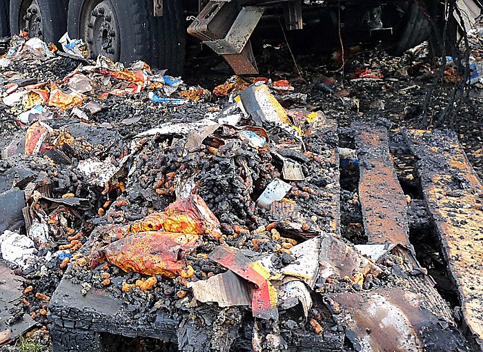 Geladen hatte der Lkw jede Menge Knabbergebäck, wie man unschwer den Fotos entnehmen kann.