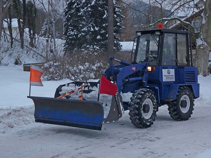 Aufmerksame Beobachter werden schon gemerkt haben, hoppla, der LKW hat nicht das typische THW-Blau. Richtig: Wie Michael Hannig gegenüber kn erläuterte, hatte der THW ein bereits über Dreißig Jahre altes Fahrzeug ausgesondert und dafür vom Straßendienst ein Fahrzeug im typischen Orange übernommen, dass hinten noch einen Kranaufsatz hat. Das heutige Schneeschieben kam gelegen, denn so konnte man gleich über, wie sich das vor gut 14 Tagen angeschaffte Schiebschild so macht.