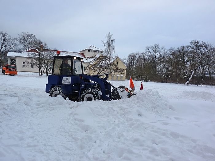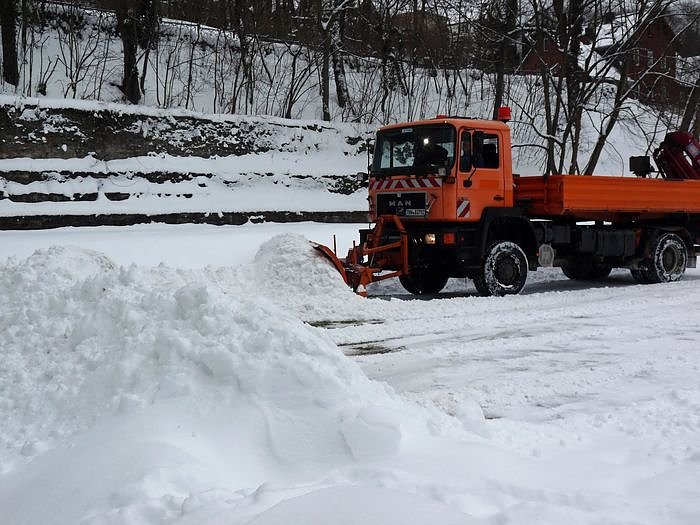 Das der Platz jetzt wieder als Parkplatz für das heutige Konzert genutzt werden kann, verdankt man dem neuen 3 m breiten Schiebeschild an dem Fahrzeug, womit man den Schneemassen schnell zu Leibe rückte.